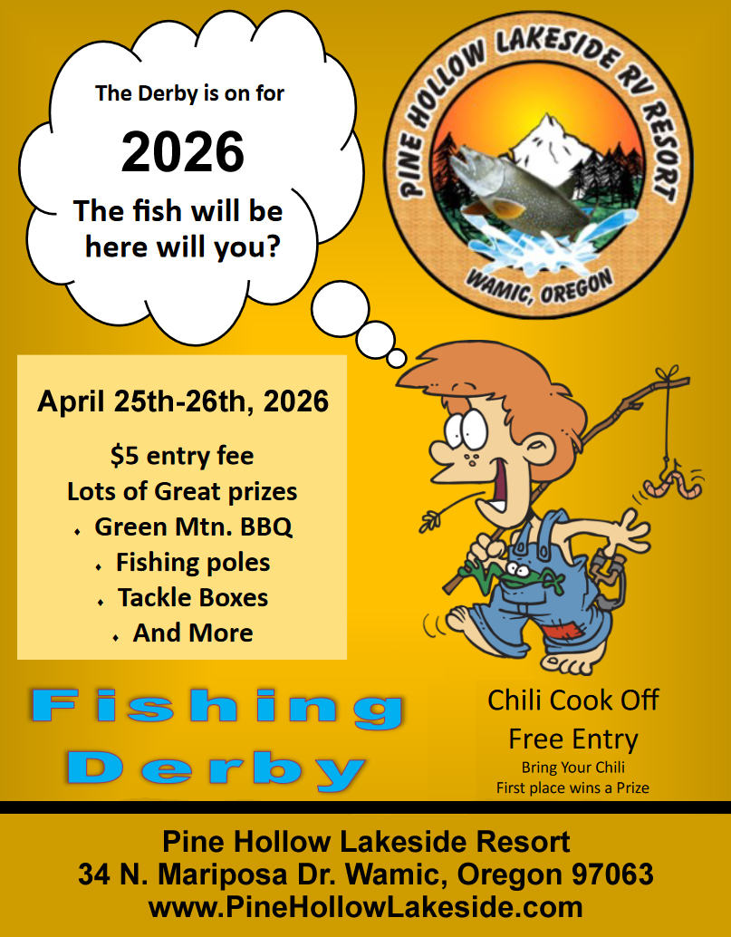 Begins half an hour after sun-up and goes thru noon Sunday. There is a $5 registration fee, and the derby is open to all ages. Lots of prizes will be awarded to the biggest catches Sunday shortly after noon. Winning catches are based on length then weight, and then the time recorded. If you catch a big one— get it to the scale! MUST BE REGISTERED TO WIN! Oh, and don't forget about our chilli cook-off...bring your chilli. First place wins a prize!
