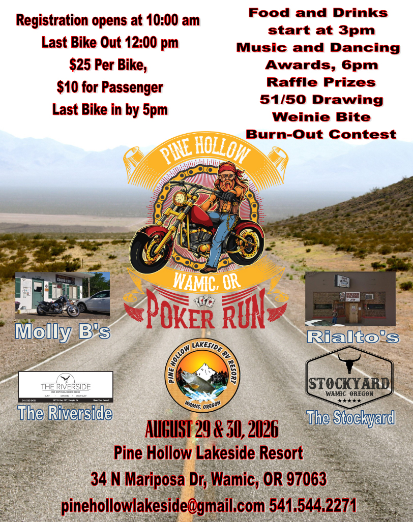 Registration opens at 10am, last bike out by 12pm. $25 per bike, $10 for passenger. Last bike in by 5pm. Food and drinks start at 3pm, music and dancing, raffle prizes, 51/50 drawing, weinie bite, burn-out contest and more.